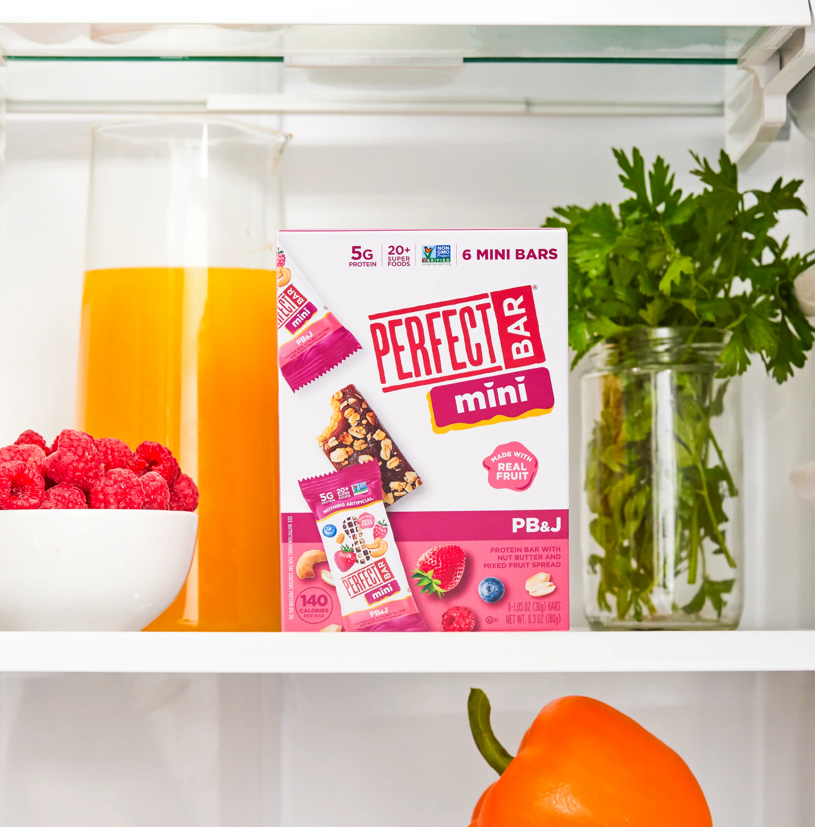 Experience the classic taste of peanut butter and jelly reimagined in a convenient, on-the-go Mini. Perfect Bar PB&J Mini is crafted with freshly ground nut butter, real fruit, crispy quinoa and toasted oats. Fridge fresh with 20+ superfoods, 5 grams of protein, and nothing artificial, it's snack time, perfected.Â